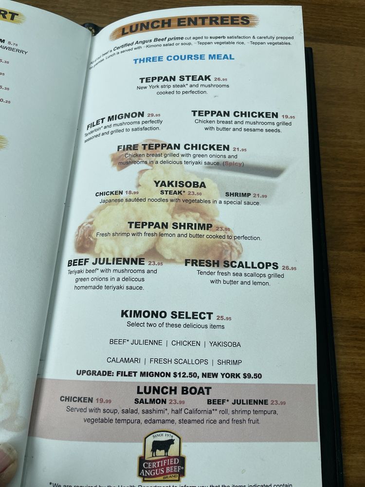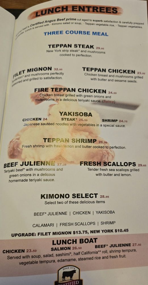 Start your journey with a six-course meal featuring savory miso soup, fresh salads, and perfectly cooked vegetables, leading to your choice of protein grilled to perfection on the Teppan grill. Don’t miss out on the Beef Julienne and Teppan Shrimp, favorites among loyal patrons.